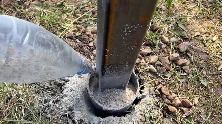 Для начала подготовьте профильную трубу 60*60 мм и сантехническую, диаметром 110 мм. Пробурите лунку, установите профильную трубу (заранее окрашенную), сверху — сантехническую. Пустоту внутри трубы зацементируйте, а само отверстие в земле засыпьте песком.
