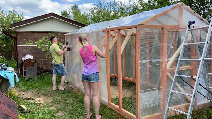 Готовая теплица из магазина или же самодельная? Какой вариант практичнее и выгоднее? Безусловно, на строительство собственной теплицы уйдёт немало сил и времени. Но если работать в 4 руки, как семейная пара ниже, то тепличка получится просто отличная и за довольно короткий срок! Оцените подробную пошаговую работу и наглядные фото процесса ниже.
