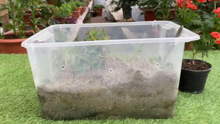 Подготовьте большой бокс (пластиковый контейнер), в котором проделайте отверстия не только внизу для слива воды, но и по бокам — для лучшей вентиляции.