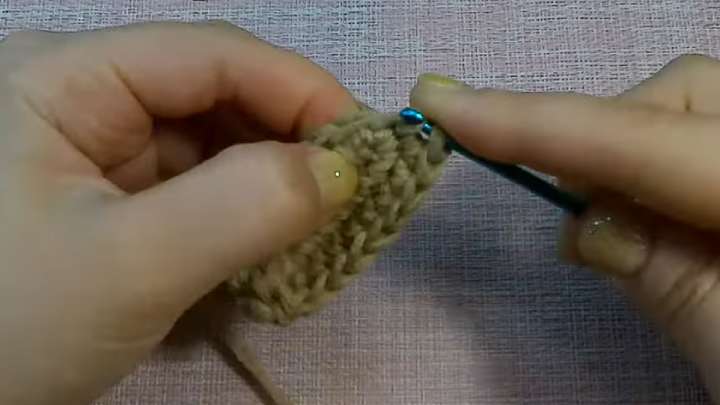 Когда «колбаска» достигнет необходимой длины (около 3 м, но можно и больше), начните закрывать конец. Для этого две петли в ряду провязывайте как одну. То есть, идёт уменьшение петель.