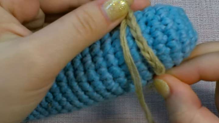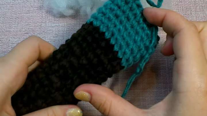 Благодаря вязанию по кругу + дополнительным петлям в первом ряду изделие начнёт заворачиваться в трубочку. По ходу вязания меняйте пряжу, по желанию. Когда провяжете примерно 7-10 см, набейте трубочку любым наполнителем: хоть синтепоном, хоть нарезанными остатками ткани, отходами джутового/льняного волокна и т. д. А затем продолжите вязать и, по ходу вязания, набивать изделие.
