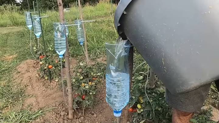 Время от времени наполняйте бутылки водой. Капельный полив значительно снижает общий расход воды, а также уменьшает трудозатраты на участке! Растения получают достаточно влаги, при этом нет вероятности перелива. Идеальный вариант для грядок с томатами!