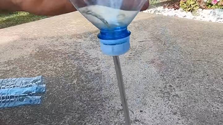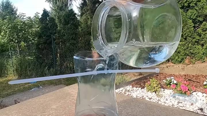 Возле обрезанного дна сделайте пару отверстий паяльником или разогретым гвоздём, чтобы можно было вставить кабельную стяжку. Наполните бутыль водой.