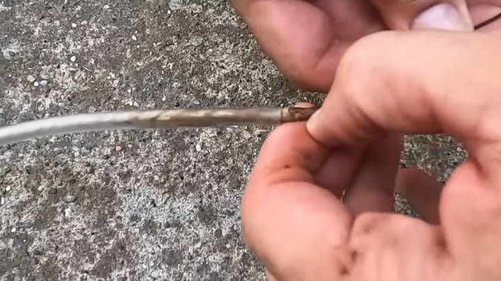 Проденьте проволоку через отрез ПВХ шланга. Когда весь шпагат будет внутри, проволоку уберите. Шпагат должен немного выступать из шланга с обоих концов.