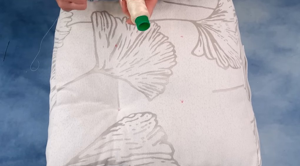 Воспользовавшись длинной иглой и капроновыми нитками, простегайте сидушку в четырех размеченных ранее точках.