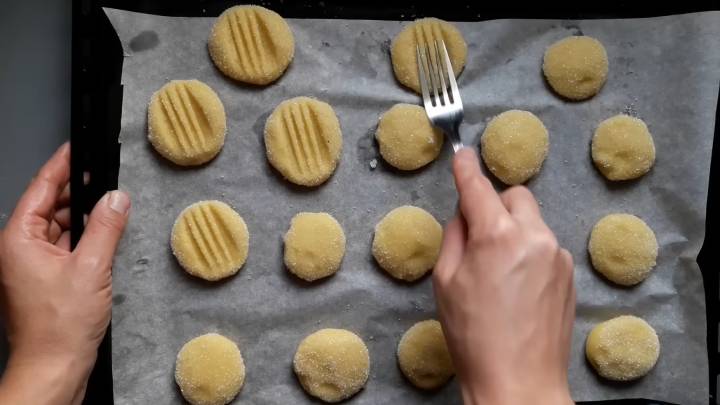 Чтобы печенье получилось красивым, сделайте декор с помощью вилки. Просто слегка придавите и проведите ею по печенью!