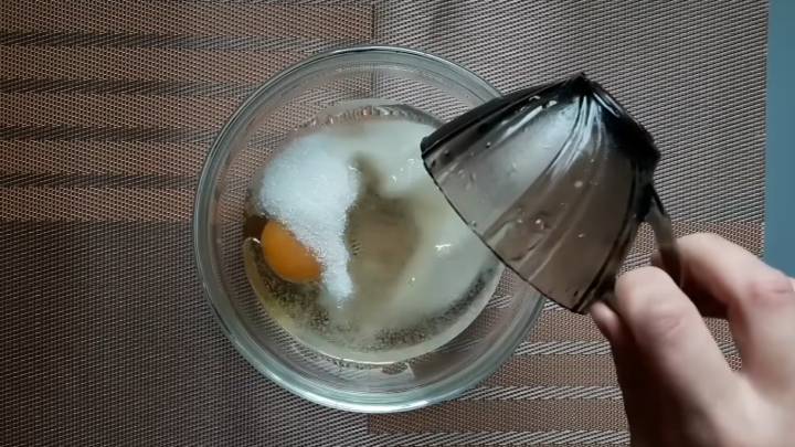 Заранее разогрейте духовку до 200 градусов. В миске соедините яйцо, сахар, растительное масло. Размешайте вилкой или венчиком.