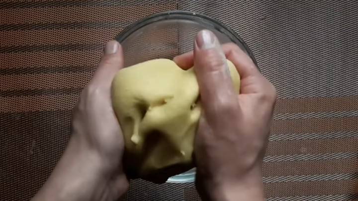 Добавьте разрыхлитель и просейте муку. Её может понадобится чуть больше. Но не забивайте тесто мукой! Как только оно стало мягким, собралось в комок и перестало липнуть к рукам и миске — всё готово.