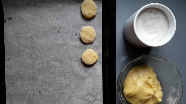 Противень выстелите пергаментной бумагой. От теста отщипывайте по кусочку, расплющивайте руками и обмакивайте в сахар с одной стороны.