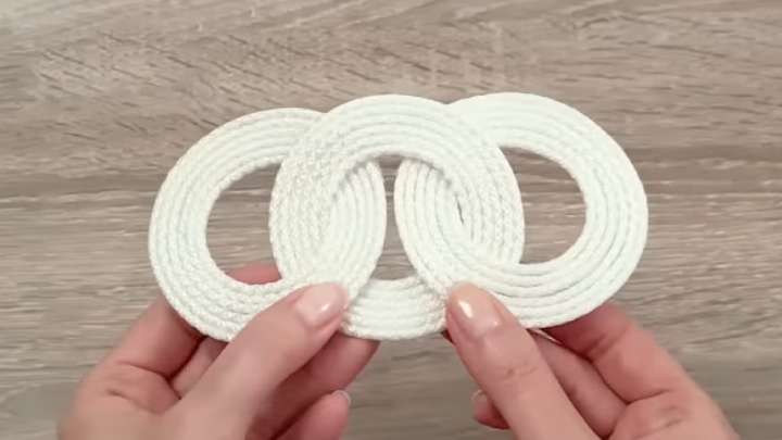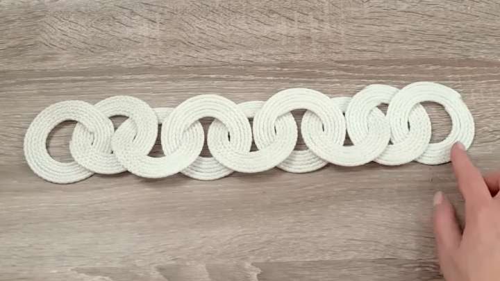 Ширина готового кольца — 2 см. Сделайте два таких кольца, а затем объедините их третьим, вставив верёвку между ними и зафиксировав клеем. Потом также закрутите в третье кольцо.