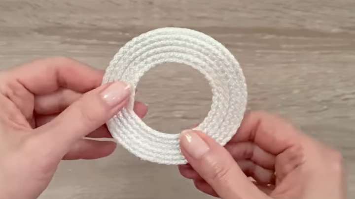 Шнур отмерьте 13,5 см, загните в кольцо диаметром 4 см, приклейте. Затем замотайте в 6 рядов, каждый ряд проклеивайте между собой.