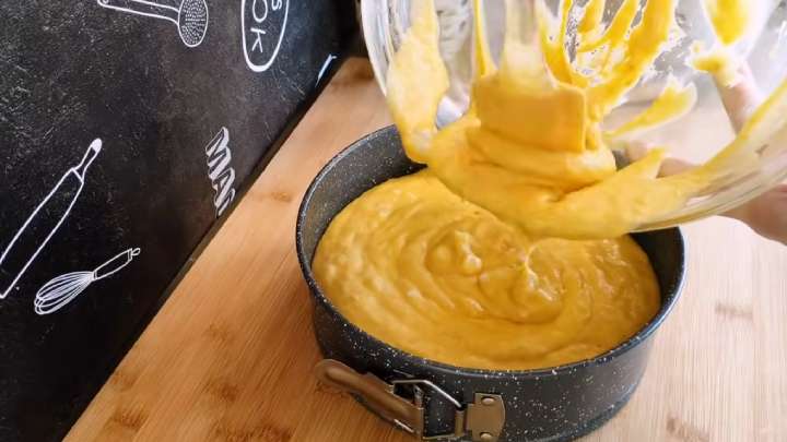 Перелейте жидковатое тесто в форму, выстеленную пергаментной бумагой.