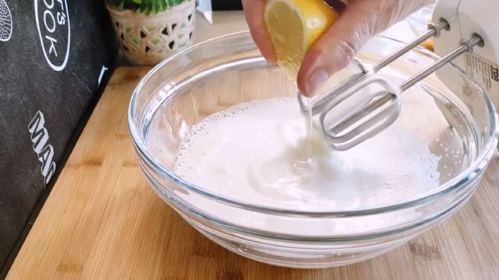 Белки отделите от желтков и взбивайте 7 минут. Затем постепенно всыпьте сахарную пудру и пару капель лимонного сока. После этого добавляйте желтки по одному, пока не вмесите в белки.