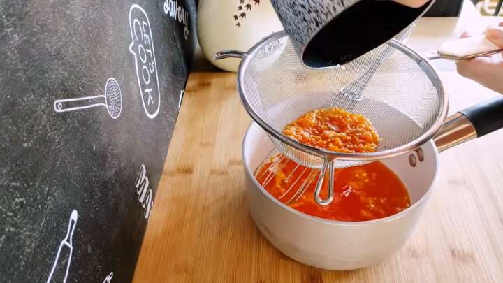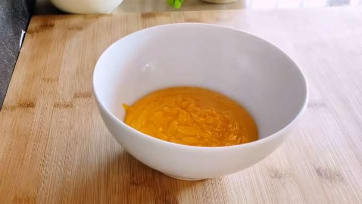 Затем процедите подслащенный сок от цедры. Перелейте его к двум желткам и крахмалу.