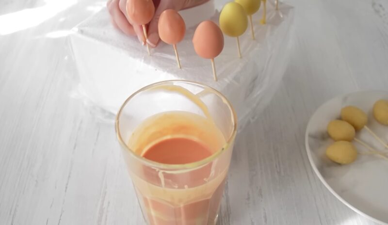Перелейте шоколад в высокий стакан. Окунайте охлажденные пирожные в шоколад. Используйте подставку из пенопласта, чтобы удобно разместить пирожные в шоколаде.