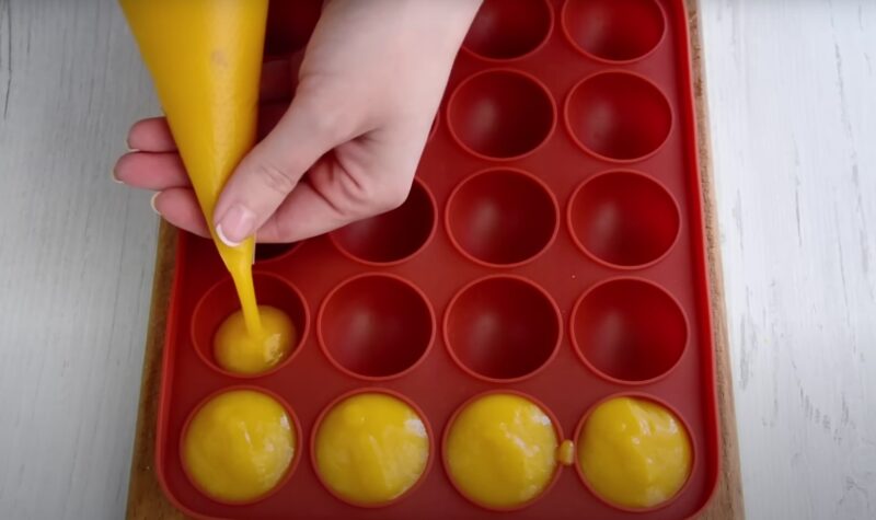 Большие пирожные можно приготовить с начинкой, которая будет имитировать желток настоящего яйца. Для приготовления начинки заморозьте пюре манго в небольших полусферах (если пюре жидкое, к нему можно добавить небольшое количество крахмала).