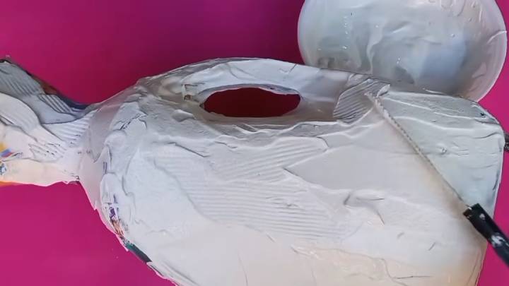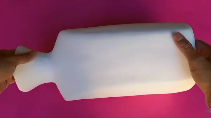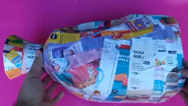 Возьмите любую бумагу (можно — газету). Клей ПВА разбавьте напополам с водой. Бумагу порвите на кусочки. Смажьте бутылку клеем. Распределите кусочки бумаги по всей поверхности, включая горлышко и ручку.