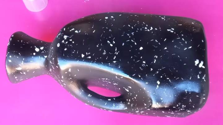 Покрасьте полностью высохшую бутылку чёрной акриловой краской (если требуется — в 2 слоя с промежуточной просушкой). После этого кисть окуните в белую краску и разбрызгайте. Покройте лаком.