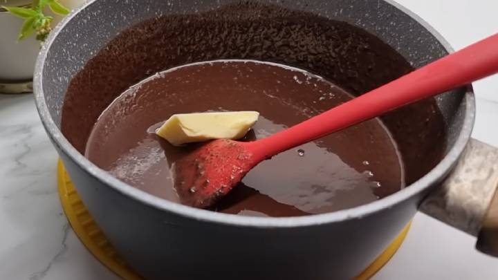 Когда все компоненты соединятся, добавьте шоколад. Продолжайте помешивать. После закипания уменьшите огонь. Когда появились пузырьки, добавьте сливочное масло. Перемешайте, дождитесь полного растворения, снимите кастрюльку с огня.
