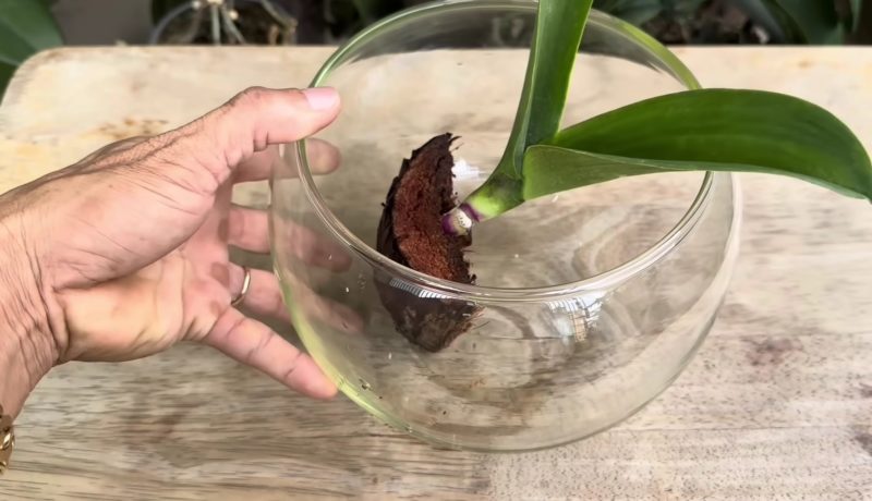 Сделайте в скорлупе небольшую выемку и разместите в ней орхидею. Поместите орхидею и скорлупу кокоса в емкость с водой. Всю необходимую влагу растение будет получать от скорлупы кокоса.