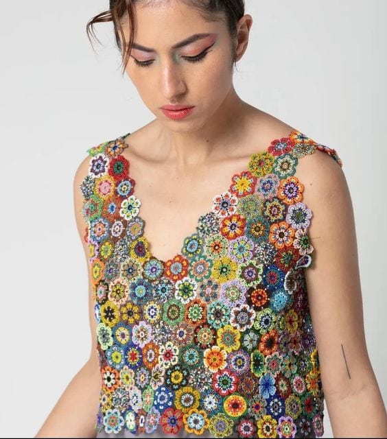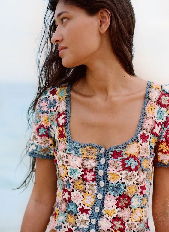 Оригинальный способ использовать остатки пряжи: вяжем топы из цветочных блоков для предстоящего лета