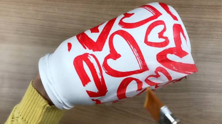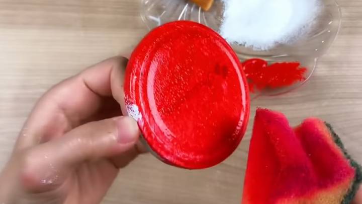 Крышки покрасьте акриловой краской и губкой. Используйте тот цвет, который сочетается с рисунком на приклеенной салфетке.