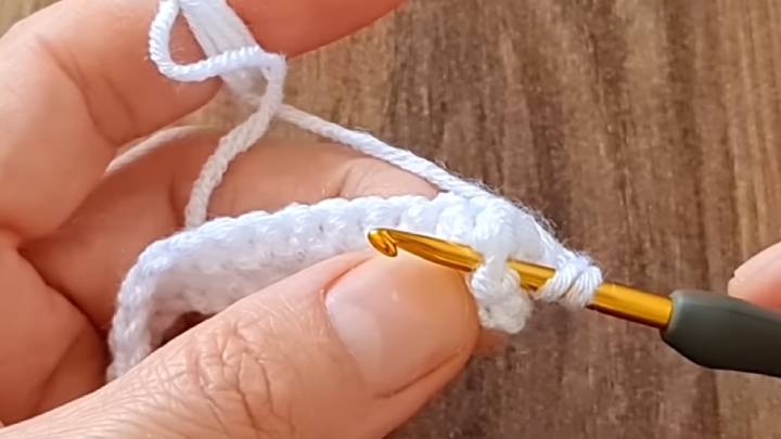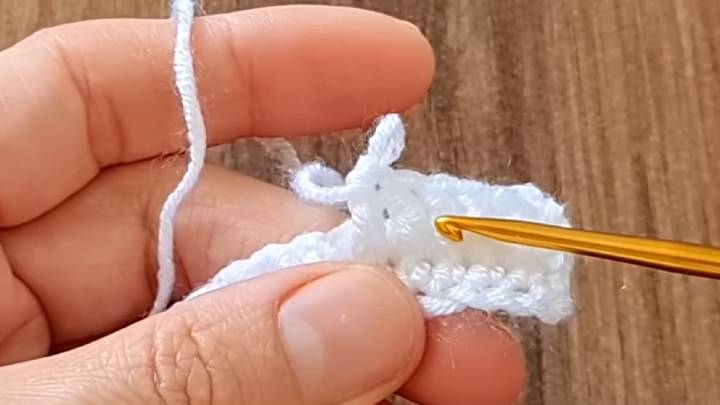 Первый элемент узора «Плетение» вяжется 6 рядов. Начать вязание 1-го ряда следует с подъёма на 2 воздушные петли. Сделать накид и завести крючок в перемычку между столбиками в первом ряду. Провязать столбик с накидом (ССН).