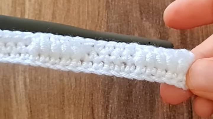 Следующие 5 петель в ряду вяжите СБН. Затем снова сделайте накид и аналогичным образом провяжите 5 ССН. Вяжите так попеременно до конца ряда. Последняя петля в ряду — просто СБН.
