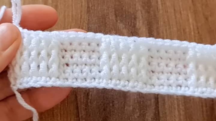Первый элемент плетения закончен. Теперь нужно сделать смещение, чтобы получилось плетение! Для этого следующие 6 рядов вяжутся точно так же, как и предыдущие, но там, где были ССН — вяжутся СБН, и наоборот. Соответственно, 7-й ряд начинается с подъёма только на 1 воздушную петлю. Первые 5 петель вяжутся СБН. Следующие 5 петель — накид, крючок вводится за перемычку позапрошлого ряда, ССН.