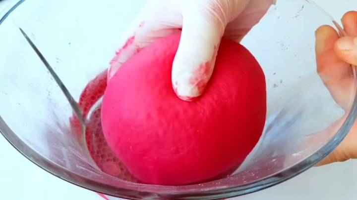 Натрите 2 крупные свеклы на тёрке. Тщательно отожмите весь сок. Добавьте в сок яйцо, соль по вкусу, размешайте. Постепенно всыпьте 350 г просеянной муки. Замесите мягкое цветное тесто. Накройте и оставьте на 5 минут.