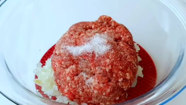 Тем временем, пока тесто отдыхает, нарежьте лук. Добавьте его к фаршу. Сюда же — соль и перец по вкусу. Тщательно перемешайте начинку.