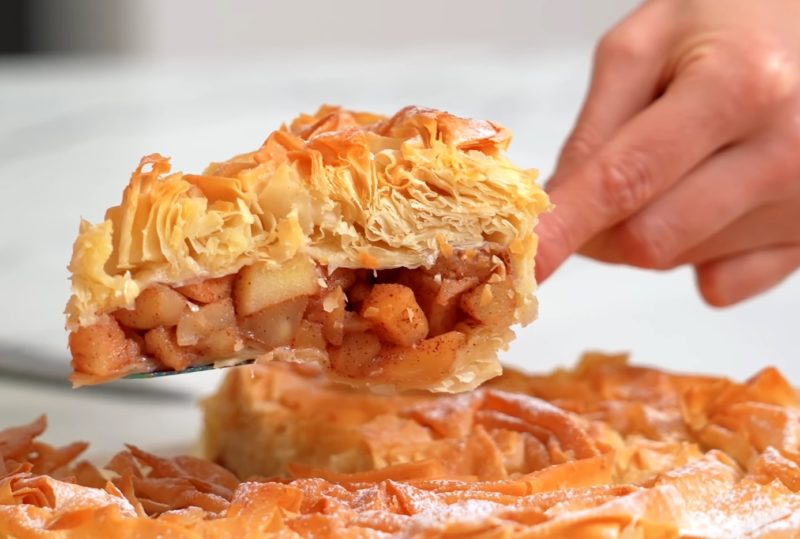 Выпечка с яблоками — это всегда беспроигрышный вариант. Пирог с яблоками можно подать и к простому семейному чаепитию и к приходу гостей, такую выпечку любят и взрослые и дети. Если привычная шарлотка уже надоела, то приготовьте удивительный пирог с яблоками «Вуаль невесты». Пирог, приготовленный на тончайшем тесте фило, выглядит очень эффектно, такую выпечку можно поставить даже на праздничный стол.