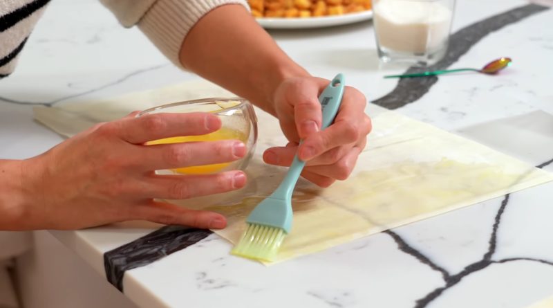Аккуратно отделите лист теста фило, смажьте его растопленным сливочным маслом и посыпьте небольшим количеством сахара.