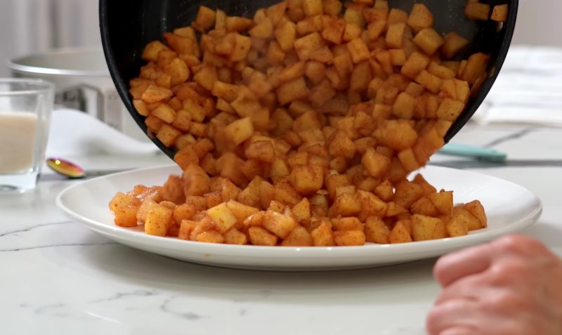 Добавьте к нарезанным яблокам лимонный сок, немного сахара, корицу и коньяк, который придаст пирогу особый аромат. Потушите яблоки на небольшом количестве сливочного масла до мягкого состояния. Оставьте начинку до полного остывания.