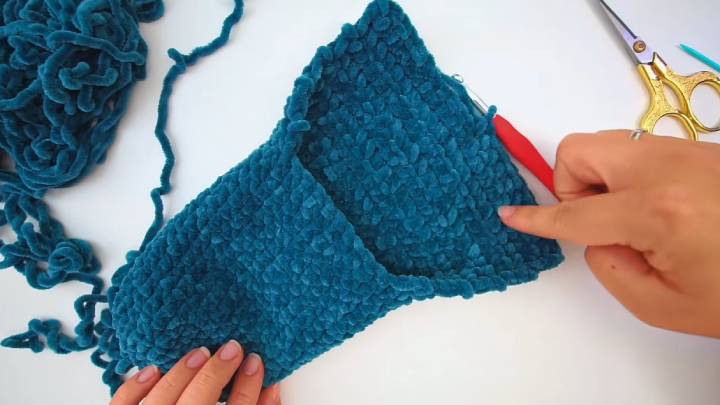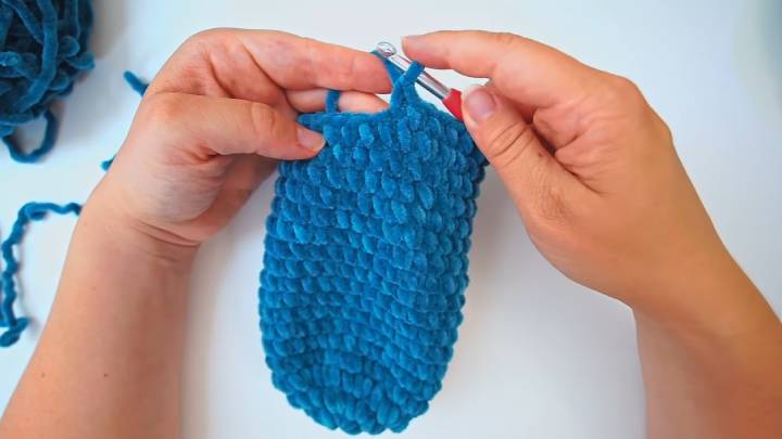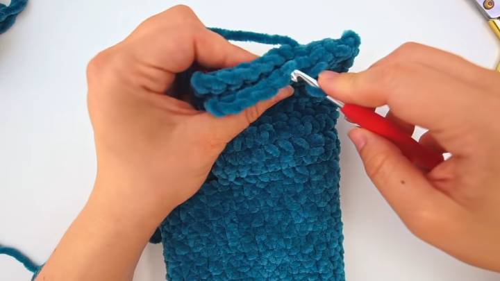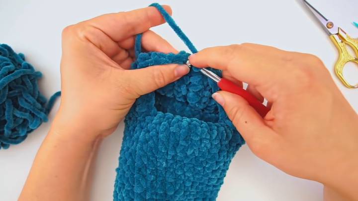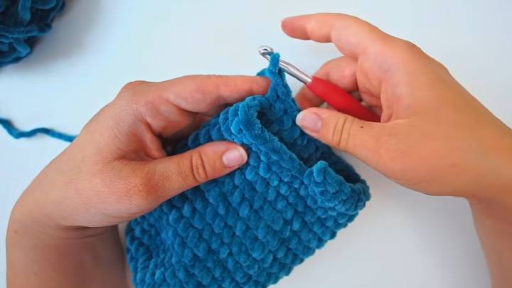 Для этого 11-й ряд провяжите до середины (т. е., 10 петель) и сложите вязание пополам. Вставляйте крючок в обе половинки и соединяйте их соединительными столбиками.