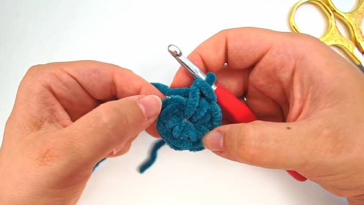 Сделайте волшебное, скользящее кольцо и провяжите в него 8 столбиков без накида (далее — СБН). Это 1-й ряд.