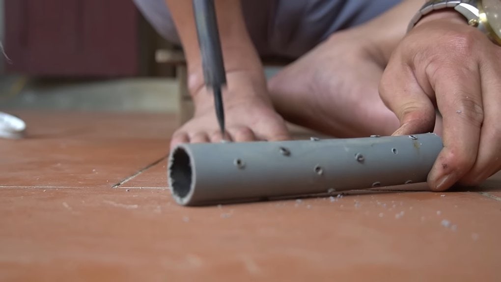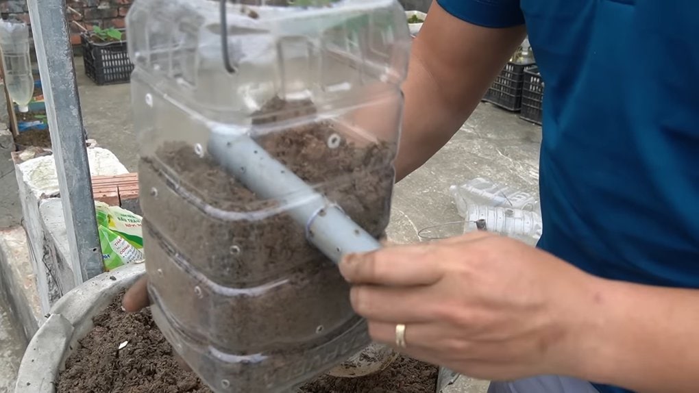 Подготовьте отрез трубы ПВХ и сделайте в нем многочисленные отверстия. В центре бутылки сделайте отверстие, диаметр которого соответствует диаметру трубы ПВХ, а также много маленьких дренажных отверстий.
