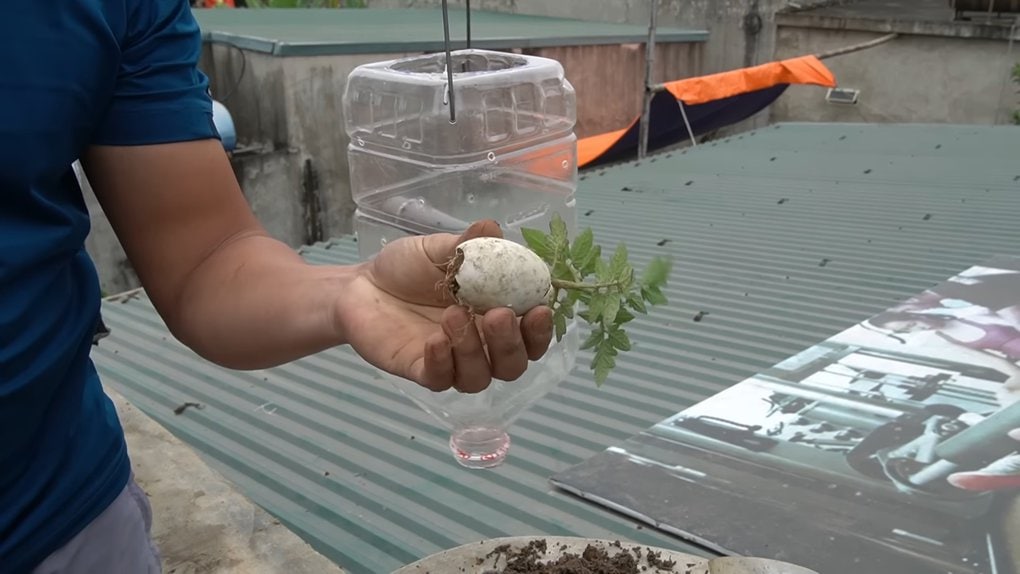 Поместите рассаду вместе со скорлупой в горлышко бутылки.