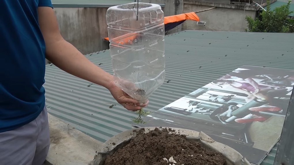 Досыпьте землю до верхнего края бутылки, сделайте небольшую лунку и посадите в нее еще одно растение.