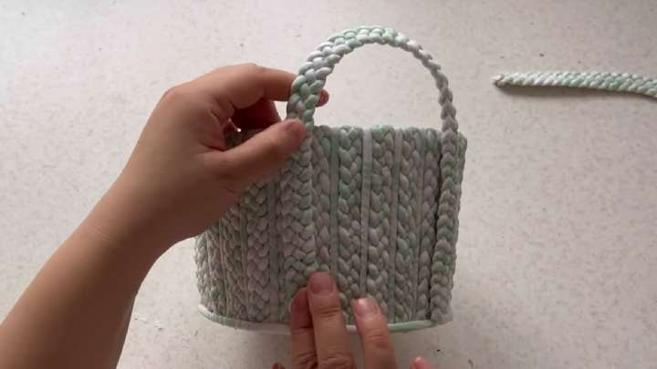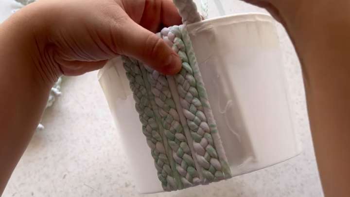 На горячий клей приклеивайте к ведёрку косички (внутри и снаружи), а между ними — добавляйте простые полосы из коврика.