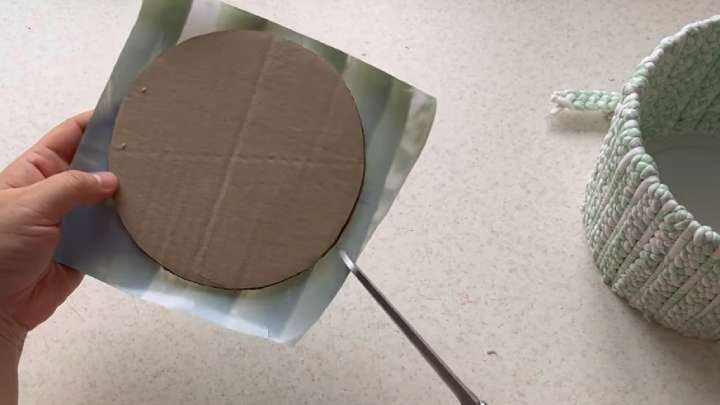 Замерьте дно, вырежьте из картона, приклейте самоклеящуюся плёнку. Вклейте картон внутрь ведёрка, декоративной стороной вверх.