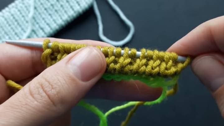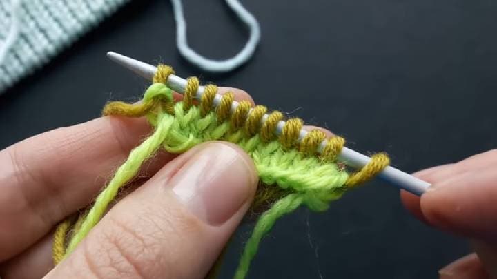 Следующую петлю провяжите со спицы — лицевой. Далее снова подхватите петлю из первого ряда, накиньте на спицу и провяжите изнаночной. Затем снова со спицы — лицевой, и т. д.