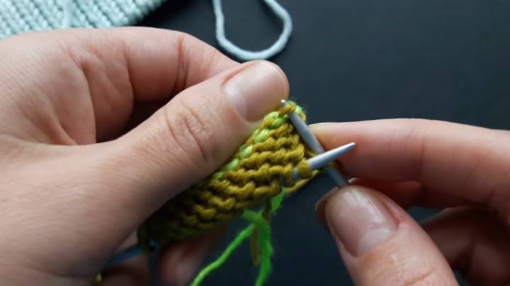 Теперь присоедините пряжу основного цвета изделия. Провяжите 1-й ряд лицевой гладью (все петли лицевые, кроме последней — изнаночной). 2-й ряд — первую снимите, все петли — изнаночные.