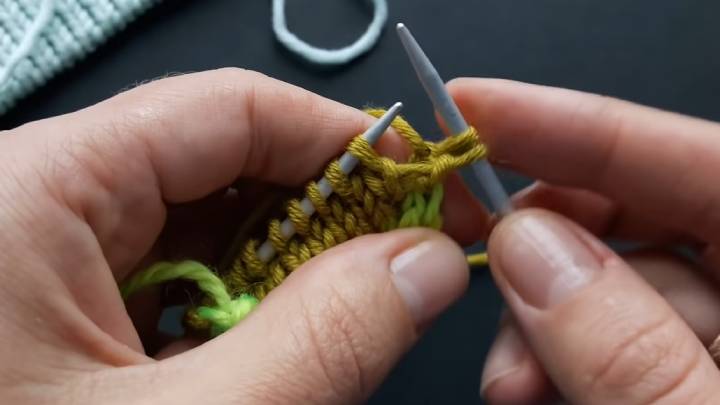 Переходим к подгибанию и формированию самого края! Количество петель при этом увеличится почти вдвое (-1 петля). Первую кромочную снимите. Теперь будем чередовать петли. Посмотрите на изнаночную сторону и подхватите петлю первого ряда сзади — они отделены контрастной пряжей и хорошо просматриваются. Подхватите первую петлю, накиньте её на левую спицу и провяжите изнаночной.