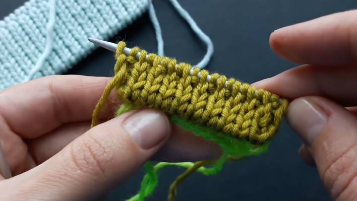 Возьмите любую контрастную пряжу подходящего размера. Наберите нечётное количество петель и свяжите всего 1 ряд: кромочную снимите, все петли — изнаночные.