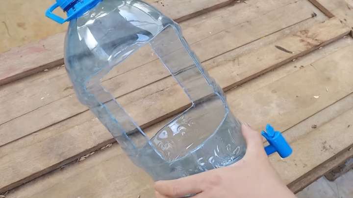 В 5 л бутылках вырежьте два окошка. Также сделайте отверстия снизу для слива лишней воды.