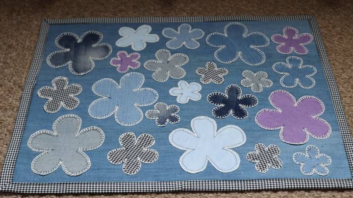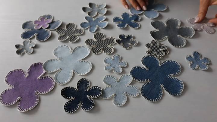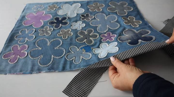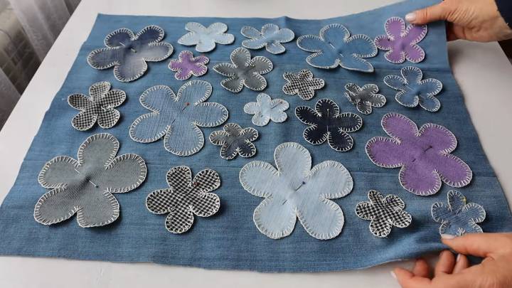 На джинсовой стороне разложите цветочки, как подскажет фантазия. Приколите булавками и на машинке настрочите их.