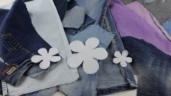 Соберите все обрезки ткани, включая джинсовую. Из бумаги вырежьте 3 цветка разного размера.