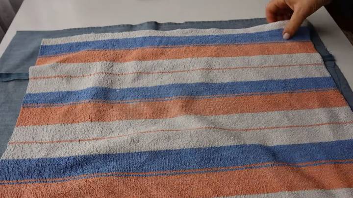 Теперь приступаем к основе! Она делается из старых джинсов и полотенца. Сколите материалы булавкой, подрежьте лишнее.