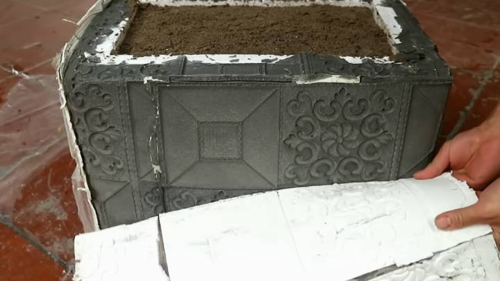 Пластиковый ящик проложите внутри плёнкой или полиэтиленовыми пакетами. Зафиксируйте скотчем. Внутрь разложите потолочную плитку с узором. Благодаря этому на готовой поделке будет фигурный рисунок.